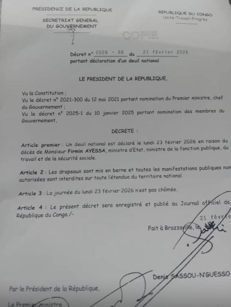 Le Cercle des Démocrates et Républicains du Congo (CDRC) a pris connaissance du décret du gouvernement de Denis Sassou Nguesso déclarant la journée du lundi 23 février 2026 « journée de deuil national » à la suite du décès de Monsieur Firmin Ayessa.